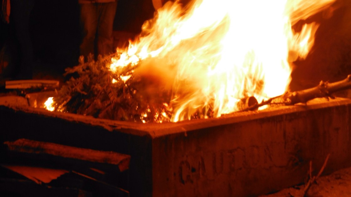 Against my advice, the guys build a pile of kindling in the fire pit. Their thoughts are that they’ll need some preliminary fire to get the trees started. They think that these dry, fragrant testaments to the holidays won’t want to burn. That unless coaxed, they’ll resist the flames.