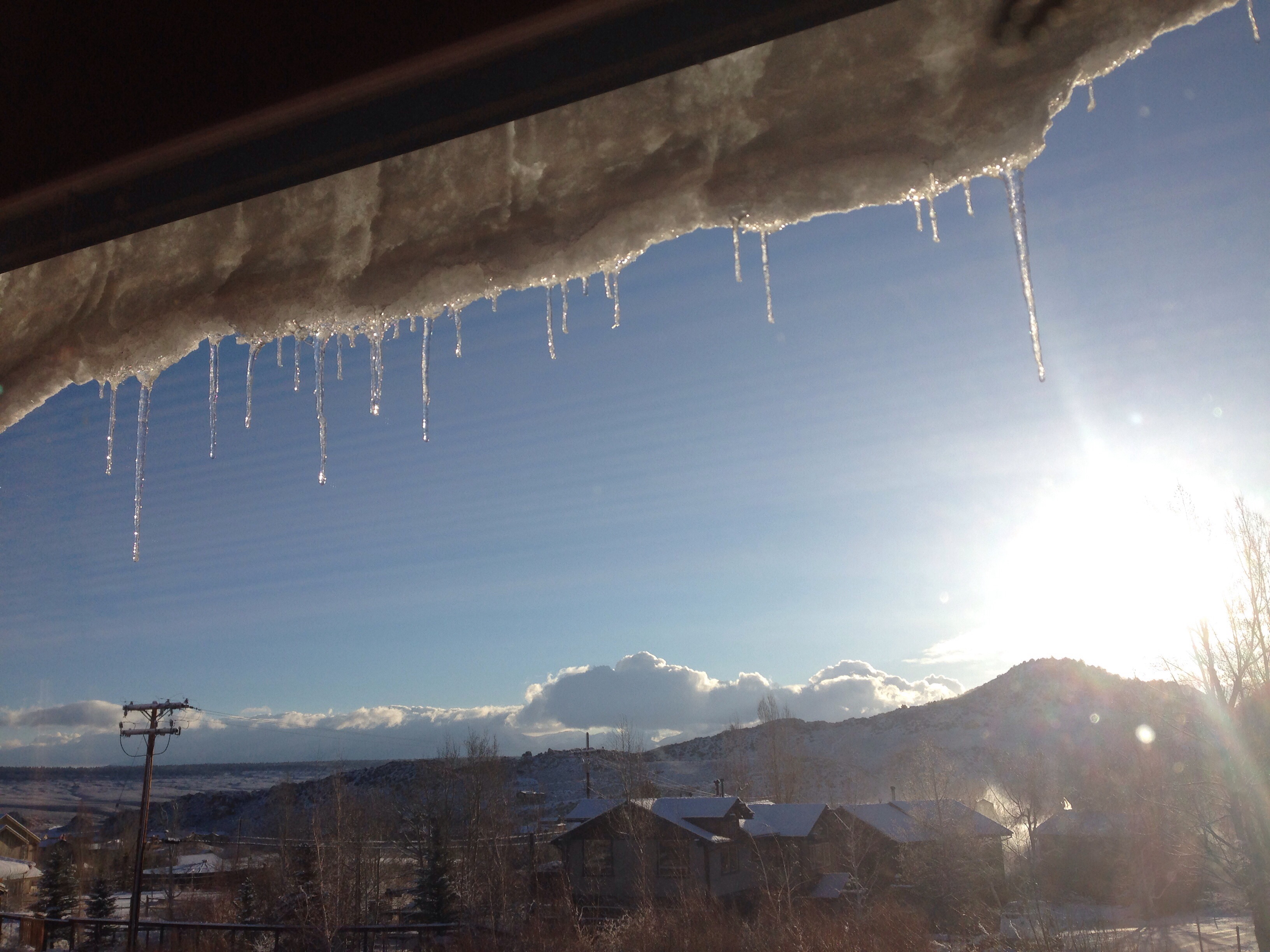 A solid hill, dusted with last night’s snow fall, sports a brilliant halo as the sun climbs its knobby spine to crest and flood my room with instant warmth. A small stand of skeletal aspen glow gold next to their bleached neighbors; they alone are touched by the light. The valley fills with soft blue shadows that then melt away as quickly as they form as the sun moves higher in the sky, turning angles to curves, corners to nooks.