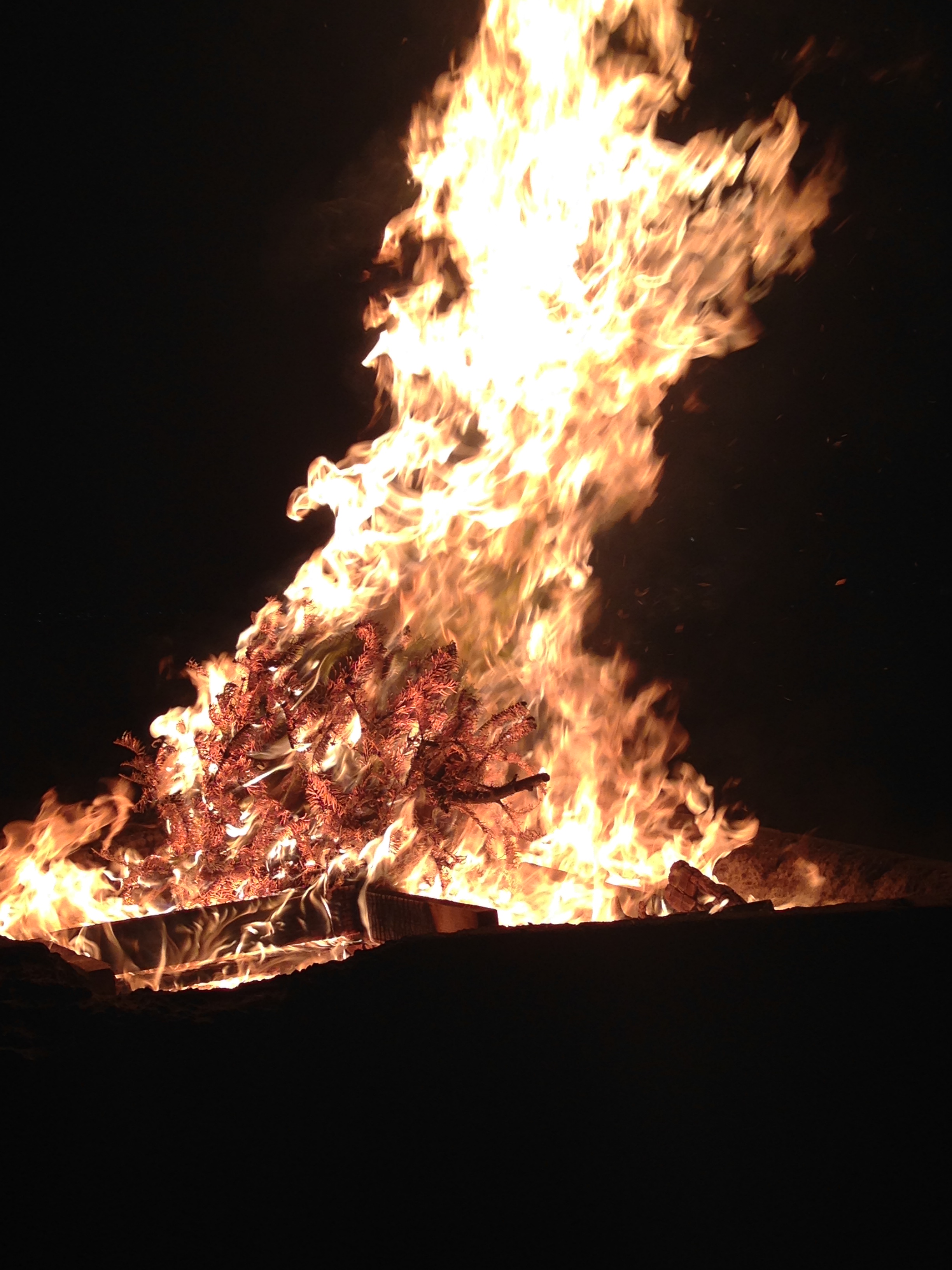 Christmas trees sing hero songs into the flame. They do not sing carols. They chorus life, cry sun, shout triumphant as branches animated by embered gilt curl, flaking onto smoke.